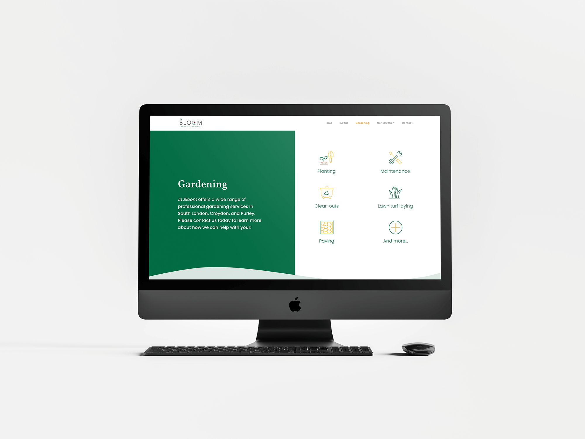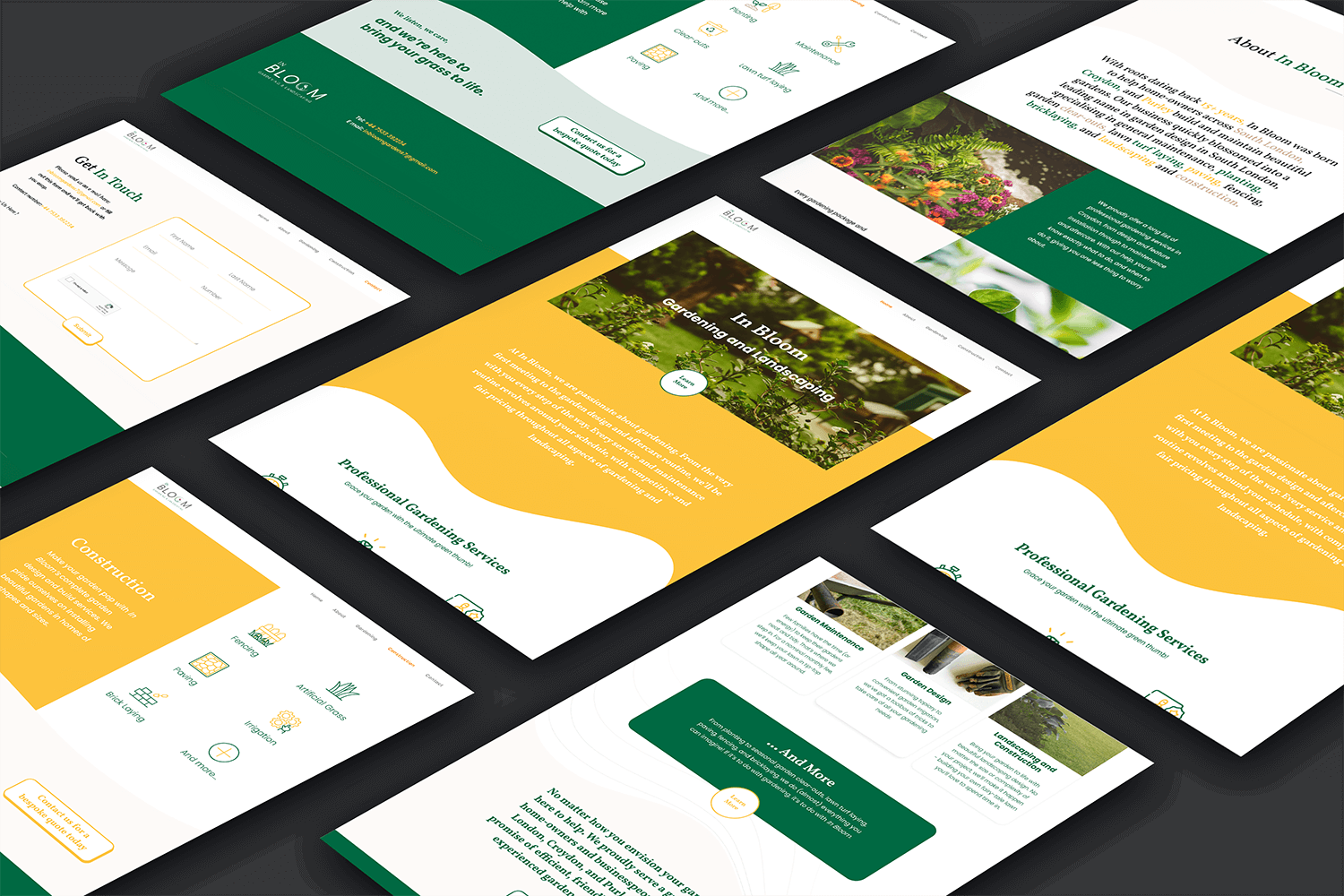 In Bloom Gardening is an independent business, well known in their community. They wanted a bright friendly website that effectively showcased their services, so I focused on earth based colours and smooth shapes that have a playful feel. This included a variety of custom icons and a rounded serif font that has a softer, more inviting feel.